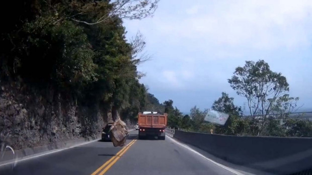 Tayvan’da bir dağ yolunda faciadan dönüldü. Dağın tepesinden yuvarlanan kaya, bir anda yola düştü. İki aracın arasına düşen kaya kısmen parçalandı ve yolun diğer kısmındaki uçuruma yuvarlandı. Olayda araçlardan birinde hafif maddi hasar oluştu. O anlarsa bir aracın kamerasına yansıdı. (İHA)