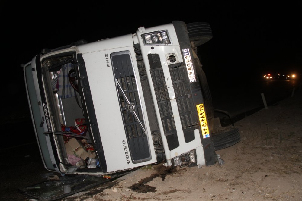 İran uyruklu Hojjat Sarouneh (32) idaresindeki İran plakalı alüminyum beton kalıp yüklü tır, Ağrı-İran karayolu Diyadin ilçesi kavşağında, sürücüsünün direksiyon hakimiyetini kaybetmesi sonucu devrildi.