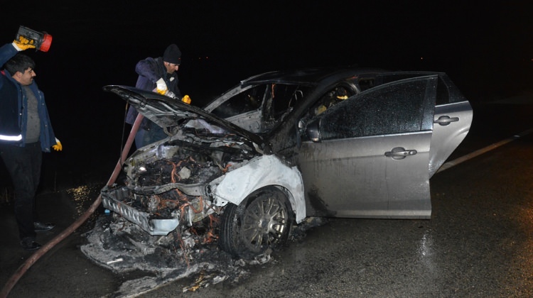 Ağrı'da, hareket halindeyken alev alan otomobil, kullanılamaz hale geldi.
