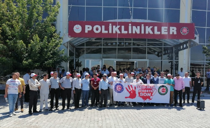 Ağrı Hak-İş Konfederasyonu Ağrı İl Başkanı Ahmet Varol tarafından okunan ve ülke genelinde sağlık alanın da yaşanan saldırılara dikkat çekilen açıklamada, "29 Temmuz'da Ağrı Doğubayazıt Yaşar Eryılmaz Devlet hastanesinden veri hazırlama biriminde Öz Büro İş Sendikamızın üyesi Ahmet Akbaş kardeşimiz hasta muayenesi sırasında fiziksel şiddete uğramış hasta yakınları tarafından bıçaklanmış ve yoğun bakıma alınmıştır.