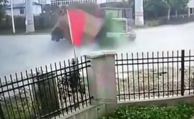 Çin’in Anhui eyaletinde kavşağa hızlı giren iş makinesi ve kamyon böyle çarpıştı.