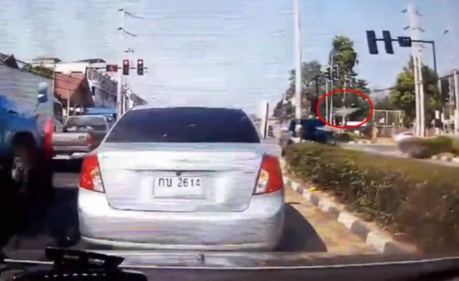 Tayland’da ışık ihlali yapan pikap, motosiklete böyle çarptı.
