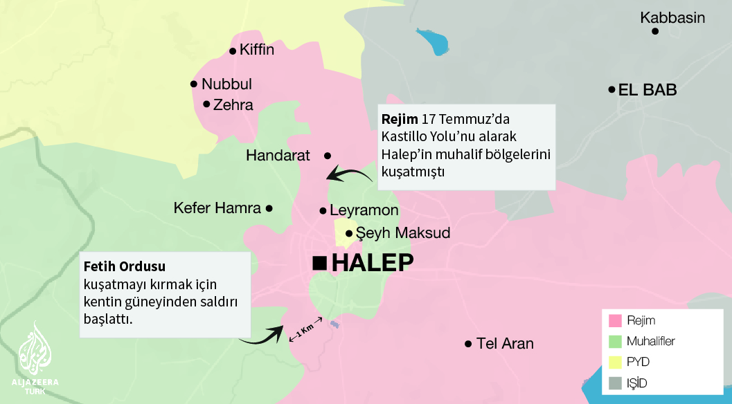 Rejim ile muhalifler arasında bölünmüş olan Halep’in kent merkezinde muhaliflerin elindeki kısım 17 Temmuz’da rejim tarafından kuşatma altında alınmıştı.