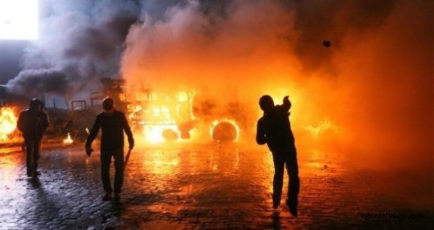 Göstericiler, meydandaki barikatları kaldırmaya çalışan güvenlik güçlerine taşlar ve molotof kokteylleri atarak yanıt verdi. Lastikleri ateşe vererek alevden bir duvar ören göstericiler, güvenlik güçlerinin ilerleyişini engellemeye çalıştı. Göstericilerin karargah olarak kullandığı bir binada da yangın çıktığı ve binadakilerin son anda dışarı çıkarıldığı belirtildi.