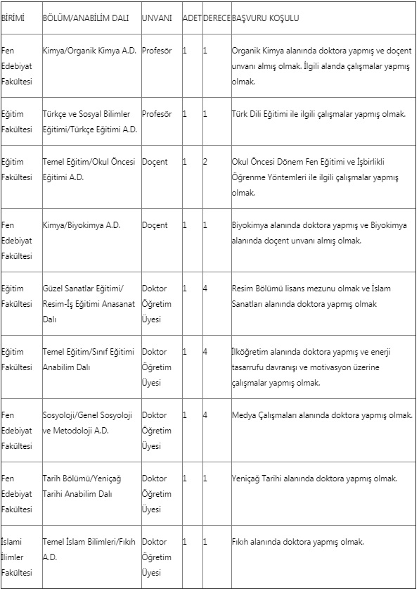 Üniversitemizin akademik birimlerine, 2547 sayılı Yükseköğretim Kanunu, Öğretim Üyeliğine Yükseltilme ve Atanma Yönetmeliği, Üniversitemiz web sayfasında yayınlanan Akademik Atanma ve Değerlendirme Kriterlerinin ilgili maddeleri ve 657 sayılı Devlet Memurları Kanunu'nun 48. maddesinde belirtilen şartları sağlayanlardan Öğretim Üyesi alınacaktır.