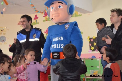 Doğubayazıt Emniyet Müdürlüğü Toplum Destekli Polislik Büro Amirliği görevlileri, Polis Haftası nedeniyle Hani Baba Anaokulu’nu ziyaret ederek öğrencilerle bir araya geldiler. ‘Kanka Polis' maskotuyla öğrencileri bir araya getiren polisler, onlara çeşitli nasihatlerde de bulundular.