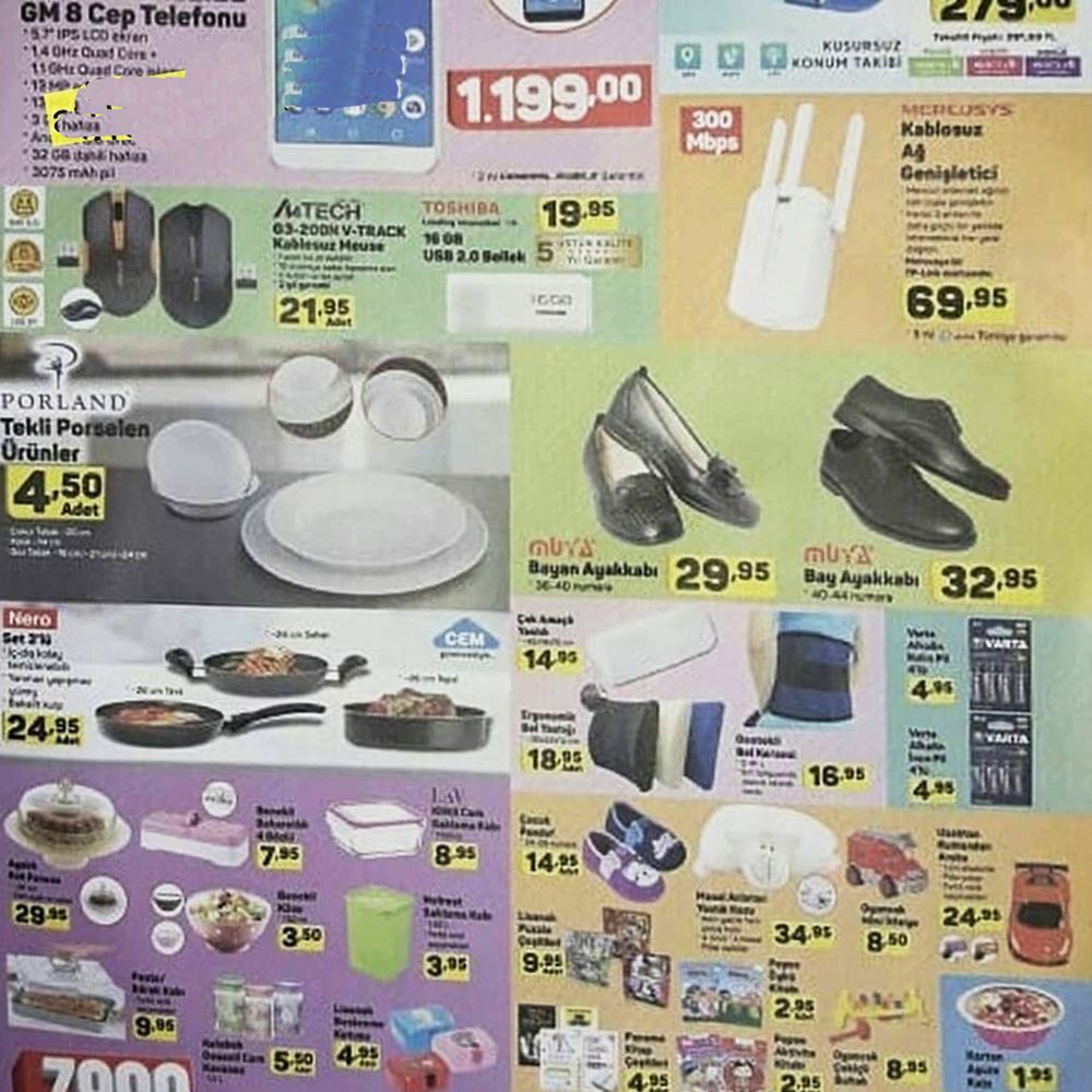 A101 20 Eylül aktüel broşürünü incelediğimizde muhteşem ürünlerin yer aldığını görüyoruz. Bu ürünler arasında elektronikten züccaciyeye, tekstilden mobilyaya bir çok harika ürün yer alıyor. Android işletim sistemine sahip, 32GB dahili hafızalı, 13MP arka kameralı ve 2 yıl garantili General Mobile GM8 Cep Telefonu 1199 TL. A4Tech Kablosuz Mouse 21,95 TL. Toshiba 16GB USB Bellek19,95 TL. Evlerinizde veya işyerlerinizde kullandığını internet hizmetinizin kablosuz olarak kapsama alanını genişletmek istiyorsanız tam size göre bir ürün var. Kablosuz Ağ Genişletici 69,95 TL. A101de bu hafta geçerli olacak 20 Eylül 2018 A101 aktüel kataloğunda yer alan ürünler arasında geniş yer kaplayan bir diğer ürün grubu ise tekstil ve giyim. Muya Bayan Ayakkabı 29,95 TL. Askılı vakum Poşeti 9,95 TL. 6’lı Elbise Askısı 4,95 TL. Pamuklu Bebek Battaniyesi 14,95 TL. Tek Kişilik Battaniye 24,95 TL. Çift Kişilik Battaniye 29,95 TL. Bay Bayan Bornoz 37,95 TL. Muya Bay Ayakkabı 32,95 TL. Çocuk Panduf 14,95 TL.