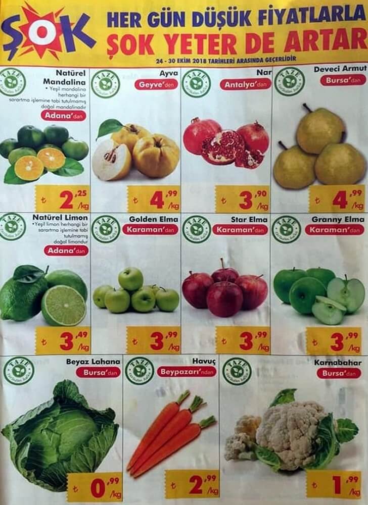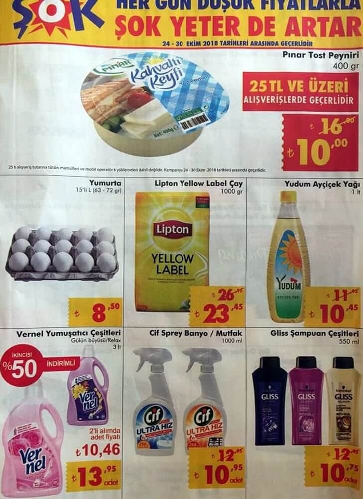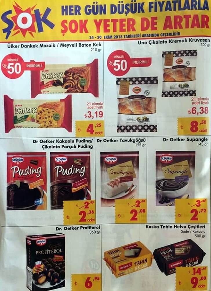 ŞOK AKTÜEL 24 EKİM indirimleri bu kadarla sınırlı değil tabiki; Evinizin ihtiyaçlarını en uygun fiyata karşılamaya yönelik kampanyalarına Şok Yeter de Artar Etiketi ile devam eden ŞOK MARKET tüm reyonlarda sizlere büyük indirimlerle ürünler sunuyor. İşte; İkincisi % 50 indirimli ürün gruplarında Ülker Dankek Mozaik/Meyveli Baton Kek 210 gr 4,25 TL yerine sadece 3,19 TL. Uno Çikolata Kremalı Kruvasan 300gr 8,50 TL yerine sadece 6,38 TL. Vernel Yumuşatıcı Çeşitleri 3lt 13,95 TL yerine ikili alımlarda sadece 10,46 TL indirimli ürünler arasında. Ayrıca; 24 EKİM 2018 ŞOK AKTÜEL ile Lipton Yellow Label Çay 1000 gr 26,95 TL yerine 23,45 TL. Yumurta 15 ‘li 8,50 TL. Yudum Ayçiçek Yağı 1 lt 11,95 TL yerine 10,45 TL.Cif Sprey Banyo Mutfak 1000ml 12,95 Tl yerine 10,95 TL. Gliss 550 ml Şampuan Çeşitleri 12,95 TL. yerine 10,75 TL indirimli fiyatları ile ŞOK MARKETreyonlarında Çarşamba günü satışa sunulacak. ŞOK AKTÜEL KATALOĞU kampanyaları arasında Manav reyonunda muhteşem ürünler sabit fiyat garantisi ile satışa sunulurken ŞOK MARKETşubelerinde yapacağınız 25 TL ve üzeri alışverişlerinizde geçerli olacak seçili ürünler arasında ise Pınar 400 gr Tost Peyniri 16,90 TL yerine sadece 10 TL. Çocuklarımız için Şokta Bu Hafta Neler var der gibisiniz; Barbie Pırıltılı Bebek 18,90 TL. indirimler çocuğunuza alabileceğiniz fırsat ürünü.