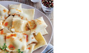 Dinlenen makarna hamurunu yumurta büyüklüğünde bezelere ayırın. Hamurları hazır yufkadan biraz daha kalınca açın. 400 gr kıyma ve kıyılmış 2 soğanı çok az zeytinyağı eklenmiş tencerede kavurun. Tuz ve karabiberle tatlandırın. 200 gr ufalanmış cevizi ekleyip karıştırın. İlk yufkanın üzerine beşer santim aralıklarla birer tatlı kaşığı harcı ekleyin (tümsek şeklinde olmalı). üzerine diğer yufkayı kıymalı harçların şeklini bozmadan yerleştirin. Harçların kenarlarına hafifçe bastırıp şeklin belirginleşmesini sağlayın. Kenarı tırtıklı hamur kesici ile harçlar ortadan kalacak şekilde kareler kesin. Tuz eklenmiş kaynar suda 15 dakika haşlayın. Süzgece alıp süyünü süzün. üzerine toz biberli kızdırılmış