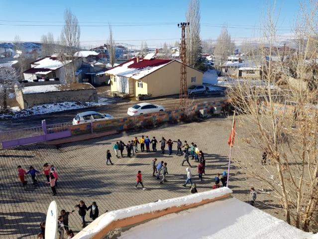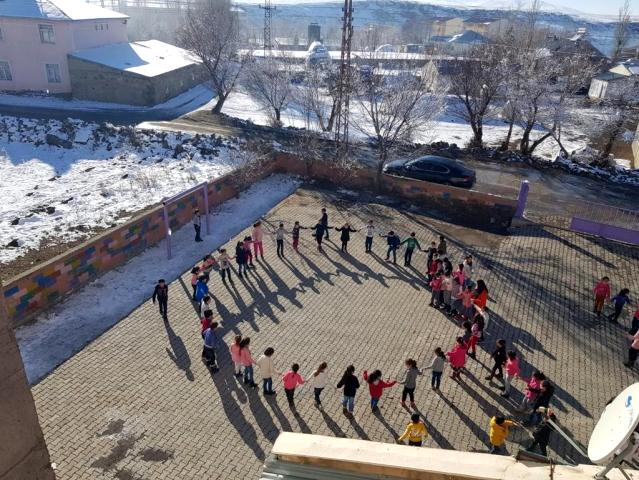 Ağrı'nın Taşlıçay ilçesindeki Balıkgöl İlkokulu öğrencileri, teneffüslerde açılan müzik eşliğinde halay çekerek eğleniyorlar.