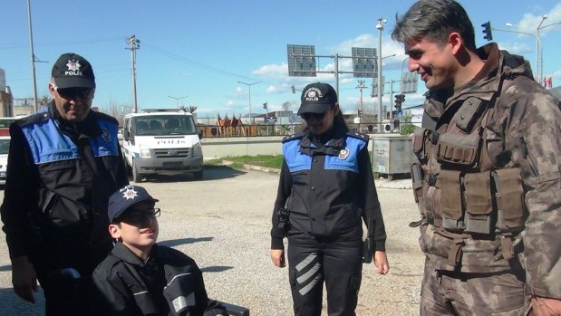 Osmaniye’de ailesi ile birlikte yaşayan 16 yaşındaki serebral palsi (beyin felci) hastası Talha Tozluklu, polis üniforması giyip ekip arabasıyla devriyeye çıktı. Toplum Destekli Polislik Şube Müdürlüğü ekipleri tarafından babası ve kardeşiyle birlikte evinden alınan engelli genç, ilk olarak Özel Harekat Şube Müdürlüğünü ziyaret etti.