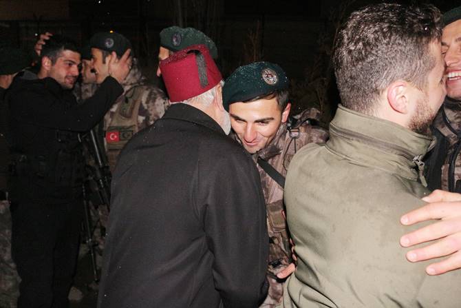 Ağrı Emniyet Müdürlüğü Özel Harekat Şube Müdürlüğü’nde görevli 44 kişi için uğurlama töreni düzenlendi. İl Jandarma Tugay Komutanı Gökhan Şahin, İl Emniyet Müdür Kenan Yıldız, İl Müftüsü İbrahim Gemici ve Polis Özel Harekatçıların (PÖH) aileleri ve yakınları ile birlikte binlerce vatandaş katıldı. Törende PÖH timleri için dualar edilip, tekbirler eşliğinde kurban kesildi. Aileleri ile vedalaşan Polis Özel Harekatçılar duygu dolu anlar yaşadı. Şube müdürlüğü önünde 7’den 70’e Mehmetçiği bekleyen Ağrılı vatandaşlar sık sık ‘şehitler ölmez, vatan bölünmez, vatan sana canım feda’ sloganları attı. Soğuk havaya aldırış etmeyen Ağrılılar ellerine aldıkları Türk bayrakları ile PÖH’leri Afrin’e uğurladı.