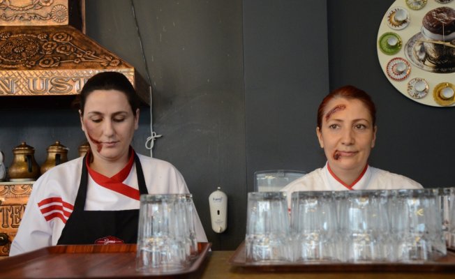 Ayten Usta Gurme Restaurant çalışanları, 8 Mart Dünya Kadınlar Günü nedeniyle yüzlerine yaptırdıkları makyajlar ile kadına şiddete dikkat çekti.