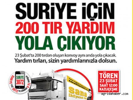 Bu tablo karşısında, bölgede yardıma muhtaç insanlar için bir çok yardım kampanyası düzenleyen İHH İnsani Yardım Vakfı, şimdiye dek gerçekleştirmiş olduğu en büyük TIR organizasyonunu yapmaya hazırlanıyor. Bugüne kadar Suriye'ye 2 bin 100 yardım TIR'ı gönderen İHH, 1 Ocak-28 Şubat arasında göndermeyi hedeflediği 500 TIR'ın 200'ünü 23 Şubat Pazar günü Türkiye genelinde düzenlenecek programlarla kaldıracak.