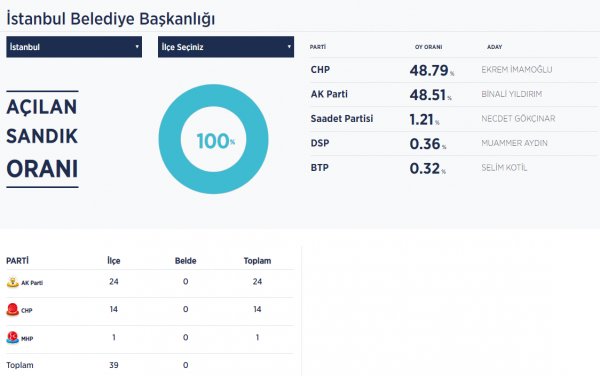 Özellikle dün gece büyük bir tartışma oluşturan "veri akışı" krizine nokta koyan AA, İstanbul'da Ekrem İmamoğlu'nun kazandığını duyurdu. AA verilerine göre İmamoğlu oyların yüzde 48,79'unu alırken AK Partili Binali Yıldırım ise 48.51'de kaldı.