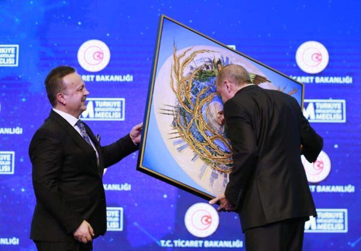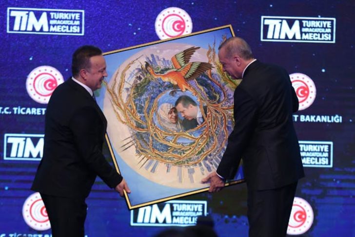 TİM Başkanı İsmail Gülle, Cumhurbaşkanı Erdoğan'a, Erdoğan ile annesi Tenzile Erdoğan'ın ressam İsmail Acar tarafından resmedildiği bir tablo hediye etti.