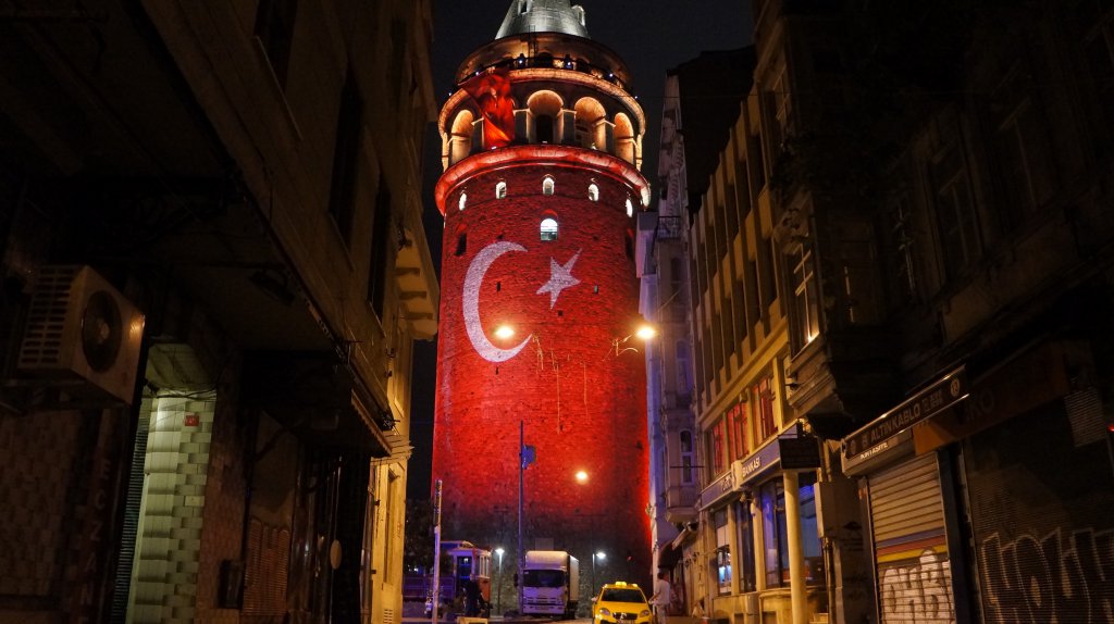 15 Temmuz darbe girişiminin ardından vatandaşların meydanlardaki demokrasi nöbeti devam ediyor. Etkinlikler kapsamında Galata Kulesi de Türk Bayrağı'yla ışıklandırıldı.