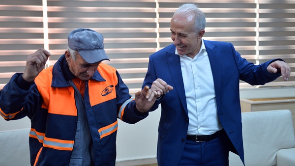 Görüntüyü izledikten sonra İsnaç'ı makamına davet eden Akdeniz Belediye Başkanı Mustafa Gültak, bir maaş ikramiye verdiği işçiyle birlikte halay çekti.