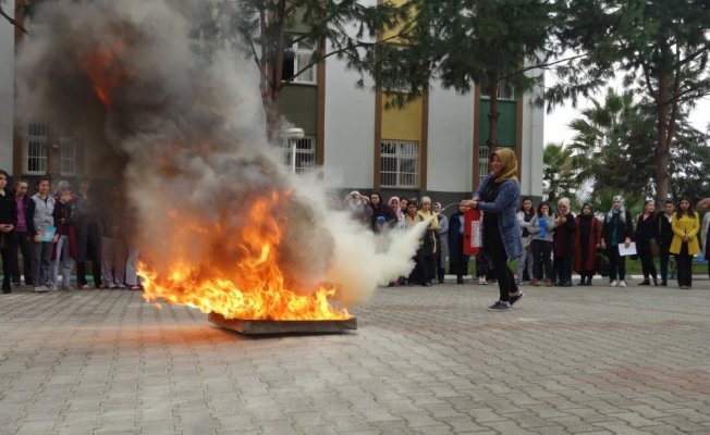 Osmaniye AFAD eğitim uzmanının öğrenci ve yurt çalışanlarına afet bilinci hakkında bilgilendirme yapmasının ardından, teorik bilgilerin uygulamaya geçirilmesi amacıyla itfaiye ekipleri tarafından yangın söndürme tatbikatı yapıldı.