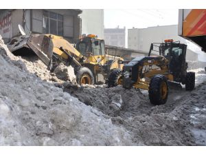 Yüksekova Belediyesi karla mücadele ekipleri, Cengiz Topel Caddesi'ndeki kar ve buz birikintilerini iş makineleriyle ilçe dışına taşıdı.