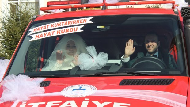 Kocaeli Büyükşehir Belediyesi İtfaiye Daire Başkanlığında itfaiye eri olarak çalışan Kudret Demirel, anaokulu öğretmeni olan Betül Dikbaş ile evleneceği günde ilginç bir sürpriz hazırladı. İtfaiyeci olan Kudret Demirel’in meslekte kullandığı aracı süsleyerek, İzmit Ayazma Mahallesi’nde bulunan gelin evinin önüne geldi. Meslektaşları ve yakınlarının alkışları arasında gelin Betül Dikbaş’ı evinden alan Demirel, yangına gider gibi sirenleri açık bir şekilde şehir turu atarak nikah salonuna gitti.
