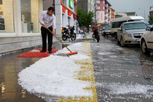 Vatandaşlar, yağışın ardından ev ve iş yerlerinin önünde biriken doluyu temizlemeye çalıştı.