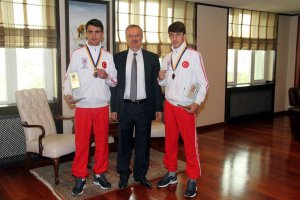 Özdemir, 57 kiloda Avrupa Şampiyonu Necat Ekinci, 60 kiloda Avrupa ikincisi Tuğrulhan Erdemir, antrenörler Vedat Demirkol ve Kıvanç Buru ile Gençlik Hizmetleri ve Spor İl Müdürü Gürsel Polat'ı makamında kabul ederek sporculara başarılarının devamını diledi.