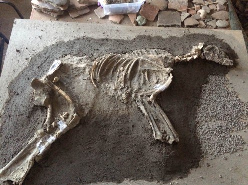 Bu noktada 2700 yıllık bir köpek iskeleti karışı karşıyayız. Geçen yıl bulduğumuz köpek iskeletini arazide olduğu şekliyle kaldırarak laboratuvar ortamında aldık. Çanak çömleklere yaptığımız işlemlerin aynısını bu köpek iskeletinde yapıyoruz.
