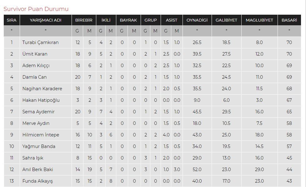 Survivor yayınlandığı her gün birbirinden heyecanlı oyunlara da ev sahipliği yapıyor. Survivor 2018'de yarışan all star ve gönüllüler yarışmacılarının bireysel ve takım yarışmalarındaki ortaya koydukları performansın sonucu puan durumu oluşturuldu. Tüm yarışmacılar arasında en iyi performansa sahip isimin kimin olduğu da ortaya çıktı. Turabi ile Ümit Karan'ın başa baş gittiği puan durumunda, Adem ve Damla ise yakın takipte yer alıyor. İpek ise hiç yarışma kazanamadı.