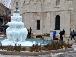 Hava sıcaklığının gece eksi 15 dereceye kadar düştüğü Malatya'daki tarihi Hacı Yusuf Taş Camisi'nin avlusundaki fıskiye buz tuttu.