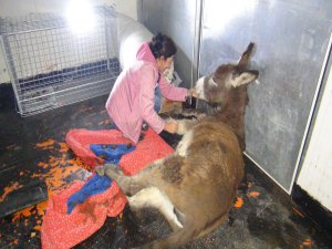 Veteriner Hekim Sefer Durmuş, yaptığı açıklamada, eşeğin ayaklarında sürtünmeye bağlı zedelenmenin söz konusu olduğunu belirterek, "Gerekli müdahale yapıldı. Birkaç gün aç kalması nedeniyle iyice halsiz düşmüş. Bu durumlar genelde hayvan sahiplerinin bu hayvanları kışın dışarıya atmalarından ötürü kaynaklanıyor. Ayak eklem yerlerine gerekli tedaviyi uyguladık. Bu tedavinin ardından dokuların oluşmaya başlamasıyla yara yerlerini dikeceğiz" dedi.