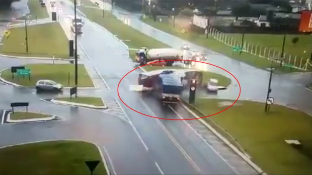 Brezilya’da meydana gelen trafik kazasında otobüs ikiye bölündü.Brezilya’da ışık ihlali sebebiyle yaşanan feci kazada bir tır otobüse, otobüs de önündeki otomobile çarptı. Olayda otobüs ikiye ayrıldı, tır da devrildi. Tır şoförü ve otobüsteki 3 kişi yaralanırken, araçlarda büyük çaplı hasar oluştu. Dehşet anlarıysa güvenlik kamerasına yansıdı. (İHA)