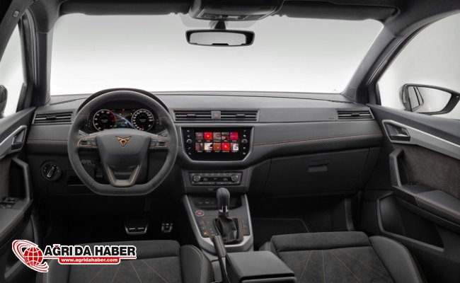 İç mekanda Alcantara® kaplı kapı panelleri, kapı eşiğinde ise alüminyum bir plaka üzerinde aydınlatmalı CUPRA logosu dikkat çekiyor. Siyah Alcantara® kaplama üzerine gri dikişli koltukların yan kısmı karbon fiber görünümüne sahip. Sportif deri direksiyon ve vites topuzu üzerinde de gri dikişler yer alıyor. Pedallar alüminyum, havalandırma girişleri ve orta konsol ise parlak siyah renkte. Direksiyonun, zemin paspaslarının, anahtarın ve motor çalıştığında sürücüyü karşılayan multimedya sistemine ait dokunmatik ekranın üzerinde CUPRA logosu bulunuyor.