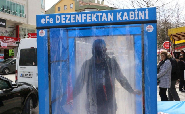 Firma sahibinin arkadaşının iş yeri önünde cadde üzerine konulan dezenfeksiyon kabinine çevredekiler yoğun ilgi gösterdi.