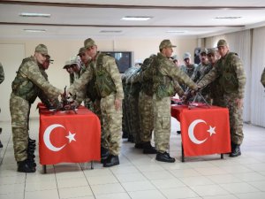 İki haftalık askeri eğitimin ardından düzenlenen törende korucular, üzerinde Türk bayrağı ve silahların bulunduğu masaya ellerini koyarak yemin etti.
