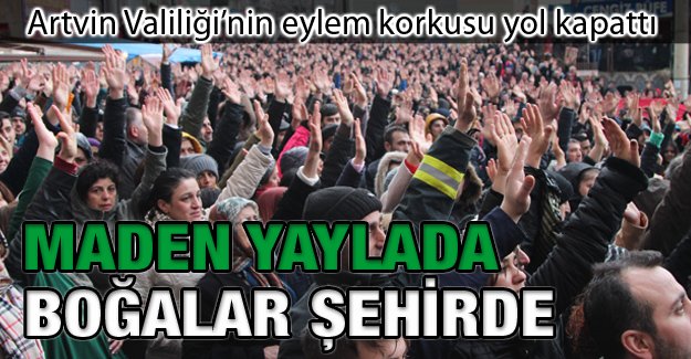 Artvinliler eylem öncesinde katlı otopark önünde toplanmaya başladı. Ardından boğa yetiştiricileri kamyonetlerle Kafkasör’de güreştirilen boğaları alana getirdi. Gençler burada dev Türk bayrağı açtı. On bine yakın Artvinli eylem saati olan 14.00’de alanı doldurdu. Halk, “Katil şirket Artvin’den defol”, “PKK’lı değiliz vatanseveriz”, “Mustafa Kemal’in askerleriyiz”, “Vali istifa”, “Vali Artvin’i kaça sattın?”, “Artvin bizimdir bizim kalacak”, sloganlarıyla şehri inletti.