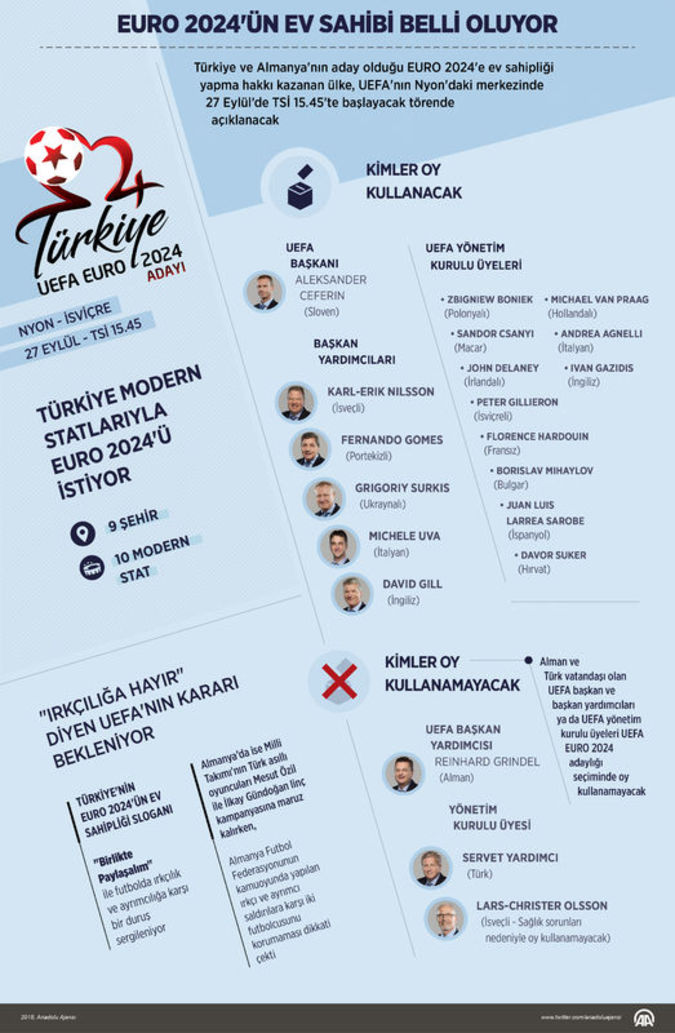 Türkiye ve Almanya'nın aday olduğu organizasyonda Alman ve Türk vatandaşı olan UEFA başkan yardımcıları ya da UEFA yönetim kurulu üyeleri UEFA EURO 2024 adaylığı seçiminde oy kullanamayacak. Ayrıca, UEFA Yönetim Kurulu üyesi İsveçli Lars-Christer Olsson da sağlık sorunları nedeniyle törene katılamayacak. Böylece, UEFA Başkan Yardımcısı Alman Reinhard Grindel, UEFA Yönetim Kurulu Üyesi Türk Servet Yardımcı ve İsveçli Olsson dışında kalan 17 kişi EURO 2024 organizasyonunu düzenleyecek ülkeyi seçecek.
