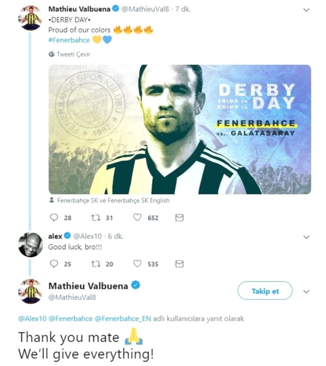 Fenerbahçe'de Galatasaray derbisi öncesinde Fransız futbolcu Mathieu Valbuena'dan maç günü paylaşımı geldi. Valbuena, ''Derbi günü! Renklerimizle gurur duyuyoruz'' paylaşımı yaparken Fransız isme Alex'ten cevap geldi.
