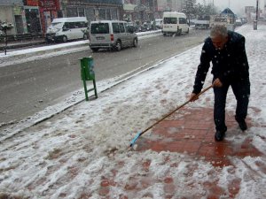 Kar yağışıyla beyaza bürünen ilçede, vatandaşlar iş yerlerinin önünde ve araçların üzerindeki karı temizledi.