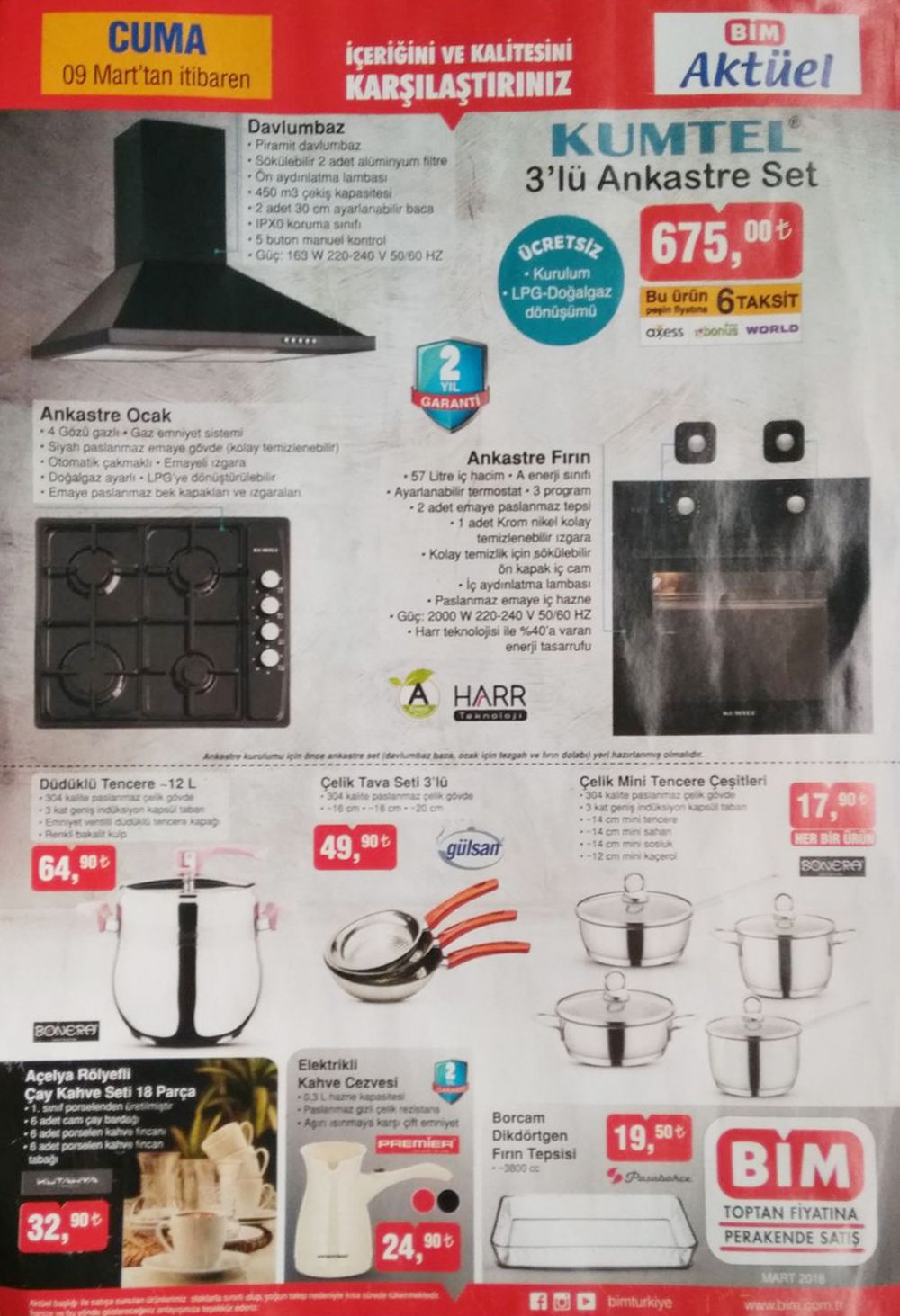 Bim 9 Mart 2018 aktüel broşüründe indirimli ürünler bu kadarla sınırlı değil. Plastik Makarna ve Pirinç Sügeci 2,50 TL. Nostaljik Kahve Seti 59,90 TL. desenli Mutfak Havlu Seti 14,95 TL. Kaymaz tabanlı 2’li Banyo Paspas Seti 17,95 TL. Bayan Klasik Terlik 6,95 TL. Erkek klasik Terlik 7,95 TL. 7’li Plastik saklama Kabı 9,90 TL. 9 Mart Bim kataloğunun ikinci sayfası ise tam anlamıyla muhteşem ürünler barındırıyor. Ayarlanabilir termostatlı, A enerji sınıfı tüketime sahip, kolay sökülebilir ve temizlenebilir ön kapak iç cam, paslanmaz emaye iç hazneli Ankastre Fırın, Akastre Ocak ve Davlumbazdan oluşan Kumtel 3’lü Ankastre Set 675 TL. Ayrıca kredi kartı kullanarak peşin fiyatına 6 taksit ile sahip olma imkanı da sunuluyor. Bim 9 Mart kataloğunda züccaciye ürünleri de unutulmamış. Bu ürünler arasında Düdüklü Tencere, Çelik Tava Seti, Çelik Mini Tencereler, Dikdörtgen Fırın Tepsisi, Elektrikli Cezve ve Açelya Rölyefli Çay Kahve Seti de yer alıyor. Paslanmaz gizli rezistanslı, aşırı ısınmaya karşı çift emniyet sistemli Premier Elektrikli Cezve 24,90 TL. Çağrı cevaplama fonksiyonlu Xiaomi Mono Bluetooth Kulaklık 49,90 TL. Ayrıca 13 Mart 2018 Bim kataloğunda yer alan bebek bakım ürünleri…